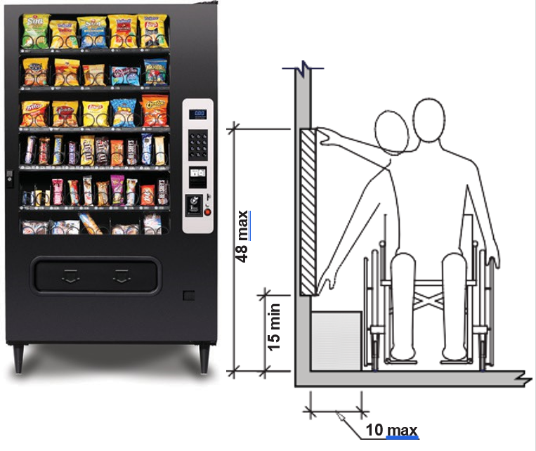 Snack and food vending machines can be optioned with delivery box that deliver products at the new American’s With Disabilities Act mandated 15” height from the floor. Ask for details on your model